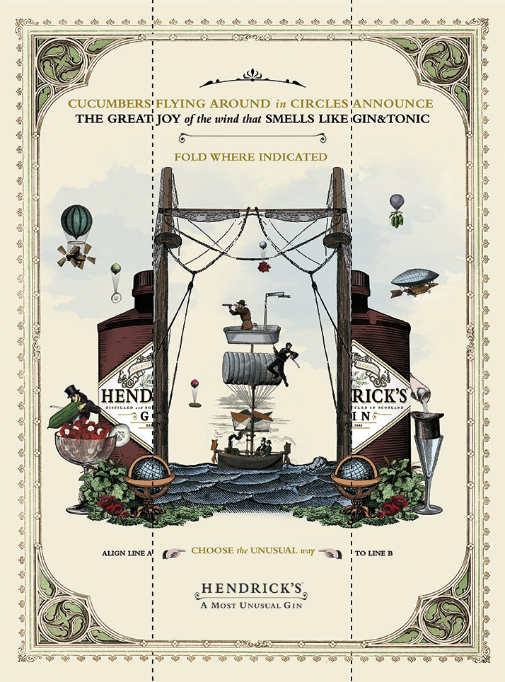 As mentioned above, the typography is presented in an extremely clever way, as a hark-back to the old MAD Magazine back pages. As much as the copy doesn’t actually have any real message as a whole, the message becomes clear when you follow the directions and fold the advertisement inward. The font used portrays the class of the brand, while still retaining a whimsical tone. It also is a similar font to the font used on the product itself, further connecting the copy with the product being advertised.