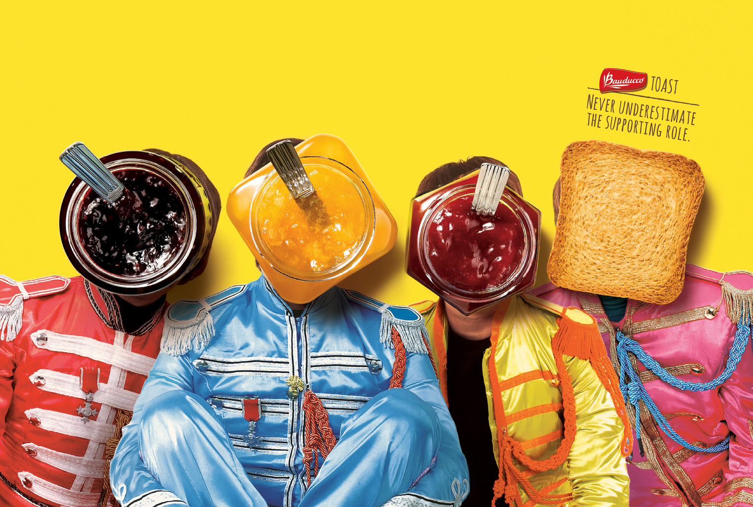 The placement of the different toast toppings leads the eye across the page, defying the standard Z shape that most advertisements use. It also follows the base picture, of The Beatles, with each topping replacing a musician’s head. This allows the eye to travel across to the specific product being advertised, and the company name and tagline used to make the ad memorable.